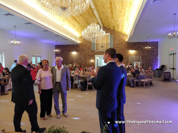 The DJ did a great job of facilitating the reception, and in particular, I loved how he did the anniversary dance. I have always seen where they start with the newlywed couple, then gradually pull up couples who have been married, five, ten, fifteen, etc. years until most people are on the dance floor. This time, however, they reversed that! We started with all married couples on the floor, then sat down by year until the only ones left standing were the newlyweds and the longest married couple. My Aunt Elsie & Uncle Tom (Nate's Great Aunt & Great Uncle, but more like grandparents) have been married over 60 years so when they were the last ones standing, the DJ had them give advice to Nate and Will. Elsie said to love each other every day as much as you do right now, and you'll be fine! It was such a sweet moment.