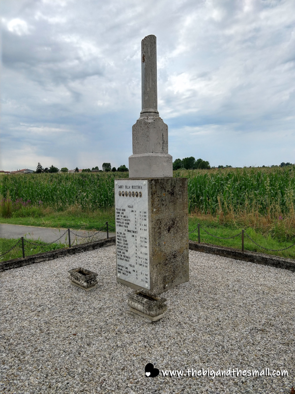 After the gelato, we wandered further out of the town towards some cornfields that reminded us of Iowa. Google maps informed Joel there was a monument ahead which we were hoping to find. We finally did find this WWII monument in a bit of an odd, out of the way place. It was on the side of the road on a roundabout - hard to walk to yet basically impossible to see if you were driving by. It was strange, especially considering the park we had passed earlier had a huge easily accessible WWI monument.
