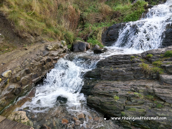 At the top of the road was a sign that told us we were entering the coastal path. It was a bit of steep walk down to a small park area then from there we could take stairs that went alongside the waterfall on the way down to the beach.