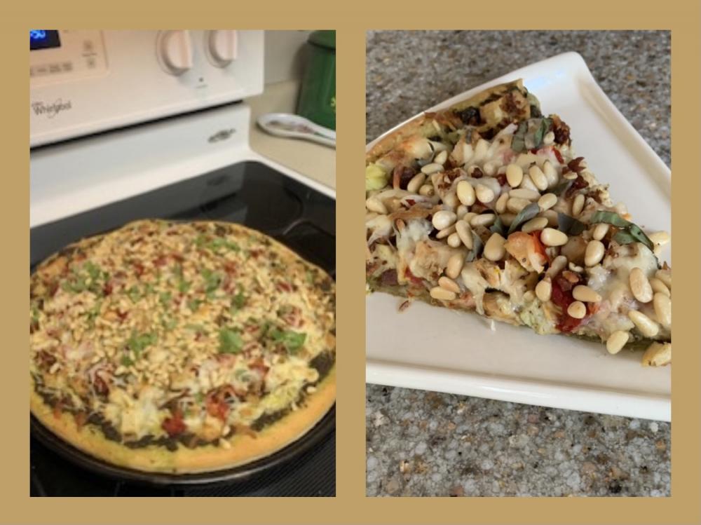 Sunday’s Creation: The herb garden is planted, so I used the last jar of pesto in the freezer....Chicken, Artichoke, Bacon, red peppers & Lemon Basil Pesto Pizza on pan crust garnished with toasted pine nuts & fresh basil (from the garden)...I also experimented & put lemon pepper in the dough. (Thanks to Matthew for the use of his oven.)