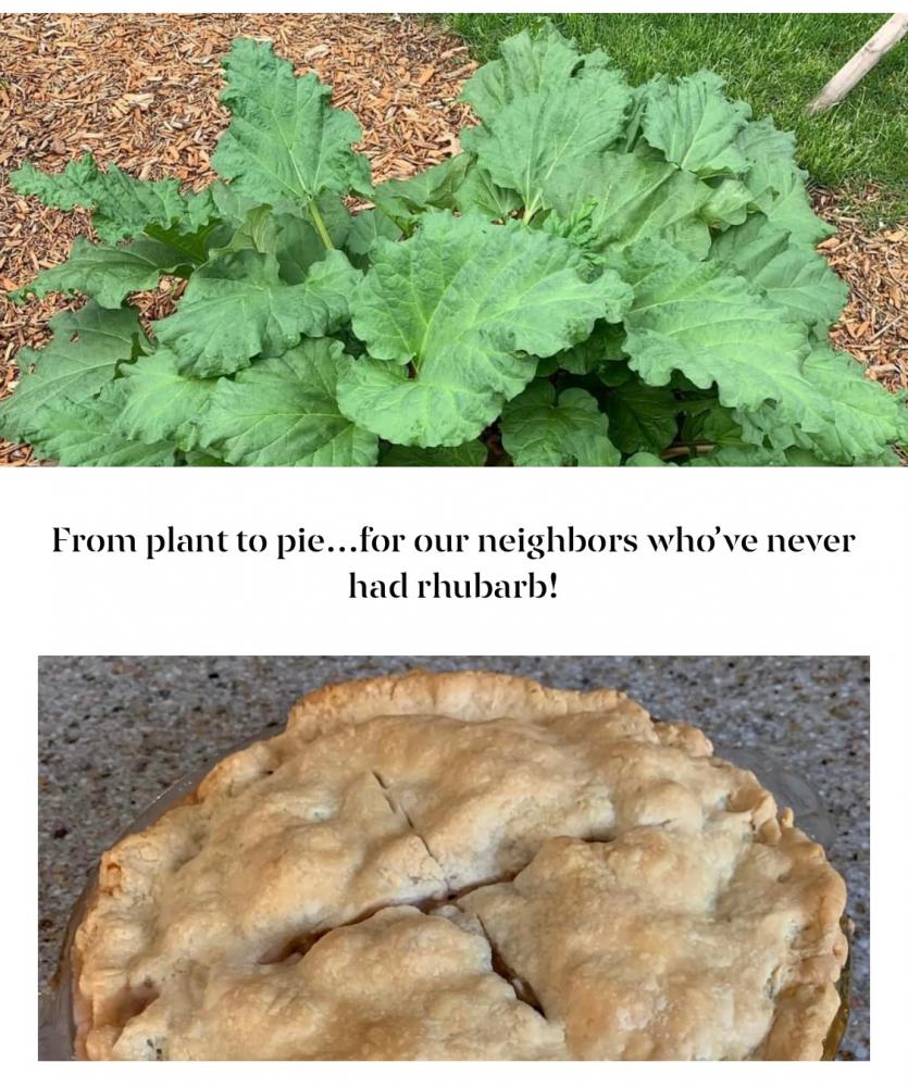 Sunday afternoon I decided I better use up some rhubarb before it gets to overgrown. So I made a rhubarb pie for our neighbors. They did not know about rhubarb, so my hubby showed it to them in the garden.