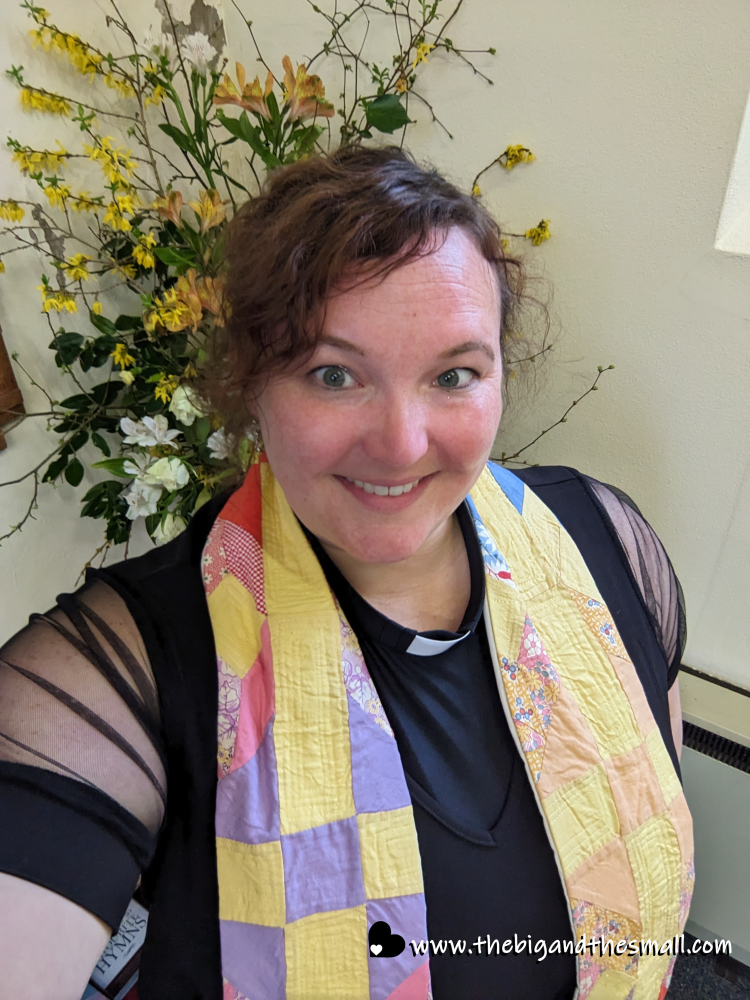 I also wore my new Easter stole. My mom and I commissioned Karen to make this one for me. It is made out of quilted fabric that my great-grandmother made and left unfinished! So Karen fashioned it into a stole and I think the yellow and other pastel colors work well for an Easter stole.