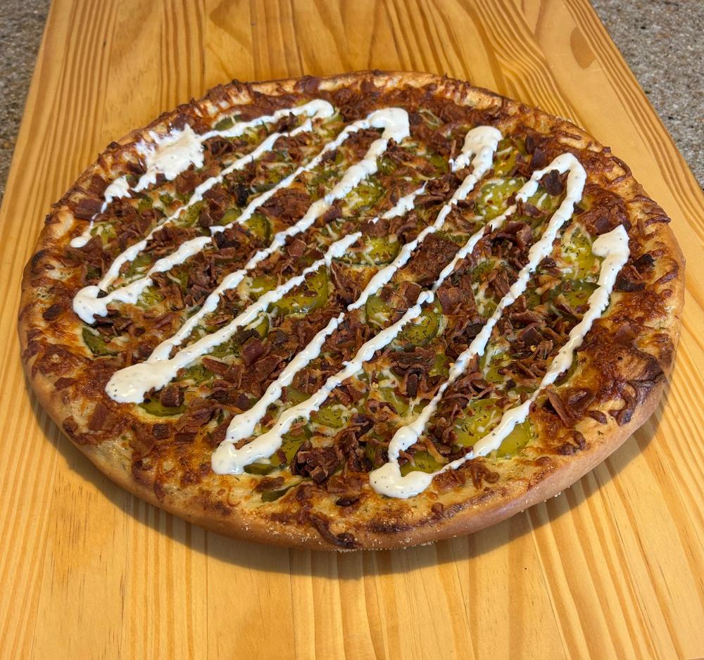 Sunday’s Creation: Dill Pickle & Bacon Pizza…pan crust stretched thin then topped with a garlic-dill sauce, Parmesan, mozzarella, dill pickles, crumbled bacon, mozzarella, red pepper flakes, dill and garnished with a drizzle of ranch dressing.