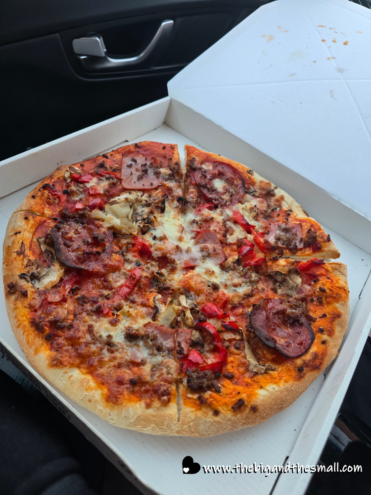 Thanks to getting our ILR just in time, on Monday the 7th, we hopped in the car and headed to France! My brother was going to be there for the week on a trip with Camp Courageous, so we made plans to meet up with him for a couple of days. The road trip turned out to take a lot longer than we thought, from start to finish, including taking the chunnel, it was about a 13 hour trip from our front door to our hotel near Disneyland Paris. We drove through a lot of small towns and noticed that almost every single one had a 24/7 pizza vending machine. You heard that right, a pizza vending machine! After passing so many of them, we finally had to stop and give one a try. It was so fun and the pizza was surprisingly good. This whole pizza was ready in like 5 minutes and only cost 4 euros!