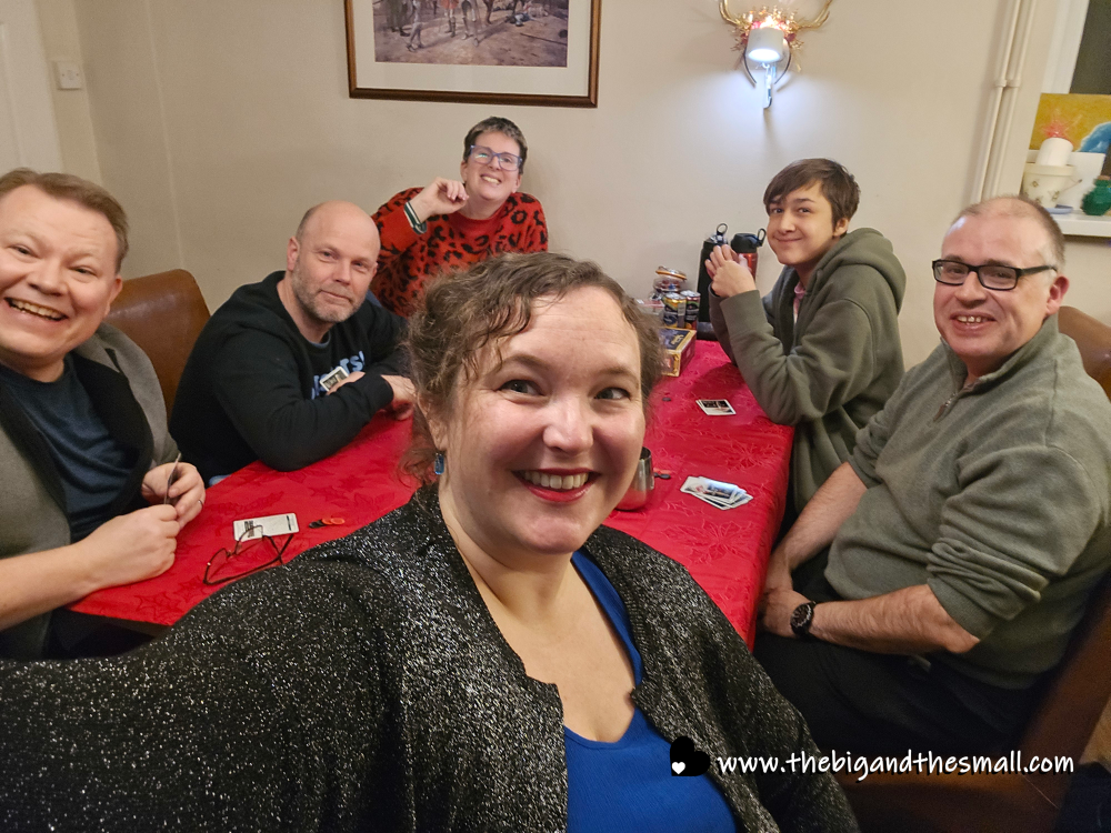 I did get a selfie of the whole crew when we settled in to play the Worst Game Ever! Then we had pizza for dinner before playing Magic and a few other games for the rest of the evening.