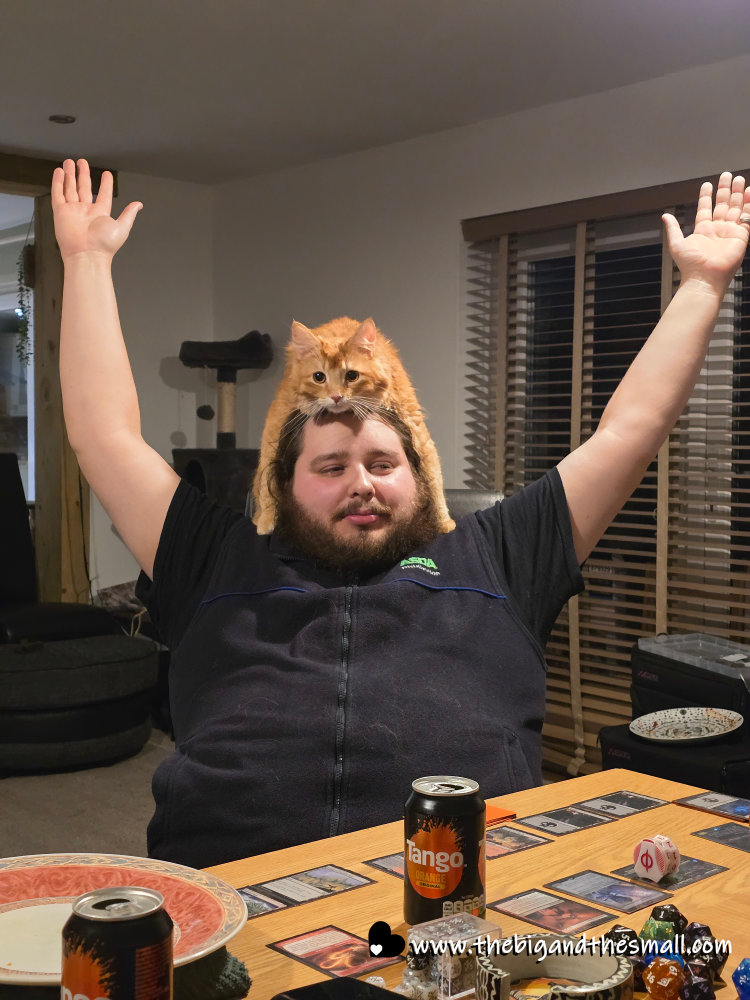 A couple of times a month, we’ve started playing Magic with some gamer friends in Newport. Harrison is a great host and even has three cats I occasionally get to cuddle with! I couldn’t resist snapping this photo of his orange cat resting on his head.