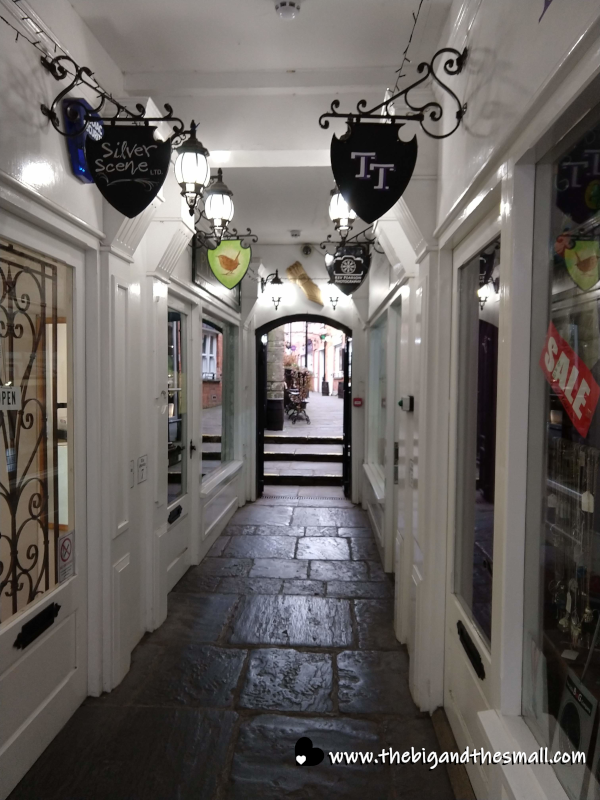 As we wandered we discovered that there were lots of little side alleys that took you into spaces with tons more stores! Our favorite was this one, called "The Gauntlet". There was a plaque on the wall that shared some history about this space. Buildings have been on this site since the 12th century, though it has all been built and rebuilt over the centuries. In 1540 some of it was built with stone that was stolen from the Abbey and some of those stones still stand! The space was turned into what we see today starting in 2003 and completed in 2007. As part of the renovations done then they discovered secret passageways between some of the buildings!