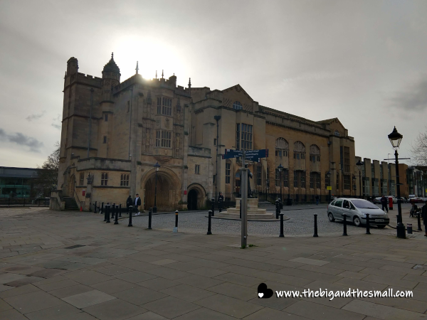The first place we explored in Bristol was an amazing block that contained City Hall (the beautiful building in the title picture) as well as Bristol Cathedral and the Central Library. The library looked amazing from the outside, and Steve and I were super excited to check out the interior. We were curious to see if the inside was still old-fashioned or if had been updated to something more modern. Unfortunately, the library is closed on Wednesdays, the day of the week we just happened to be there. Whomp, whomp.
