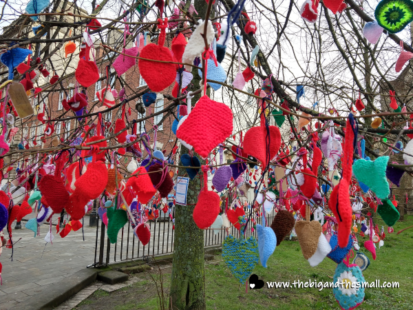 Once the cathedral was thoroughly explored, we stepped back outside to continue exploring the city. On the property of the cathedral was a tree which, while bare for the winter, was an explosion of color. As we got closer I realized it was covered in hearts and other various shapes that had been knitted and hung on the tree. A sign on the trunk informed us this was a "yarn bomb" to celebrate the community support and fundraising that had been given to the Bristol Heart Institute. The yarn decorations were to remain up until the 18 of February, and the sign gave information as to where further donations could be made.