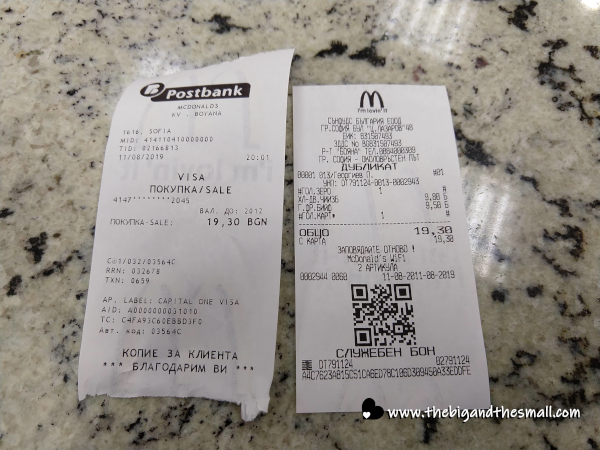 Eventually, someone pointed us to a teeny tiny menu on a side wall that had the translations from Bulgarian to English. After reading through it we realized there really wasn't anything too unique on offer here. It really just seemed like a standard American McDonald's menu, with the exception of one burger that looked somewhat different. So we ended up ordering the Grand Fresh burger, and a double cheeseburger meal. I figured if I couldn't have something uniquely Bulgarian I'd get my usual McDonald's order and compare that! Our total cost was 19.50 lev which was a little over $11.