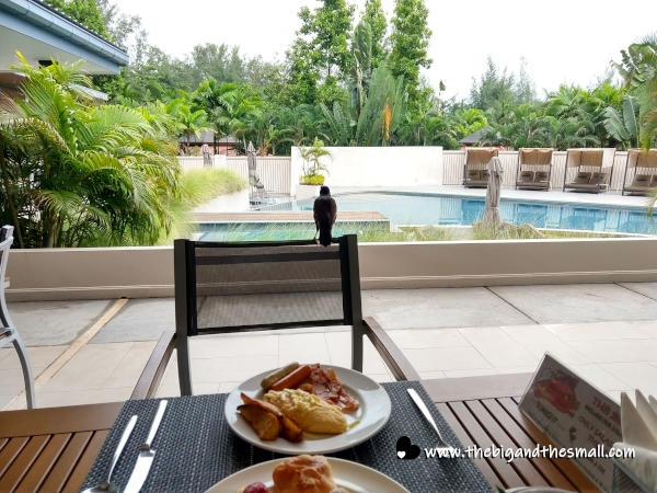 The breakfast that was included at this hotel is by far the best hotel breakfast I have ever had. I never did take a picture of the whole spread but wow was it huge! They had pretty much every possible choice you could want for breakfast from cold stuff like cereal and pastries to made-to-order eggs/omelets, all the ingredients for an English breakfast, and many popular Asian breakfast choices as well. This is the best picture I snapped of breakfast, you can see Joel's plate but really I was trying to get a picture of the bird that tried hanging out with us. Behind that you can also see one of the two pools at the hotel.