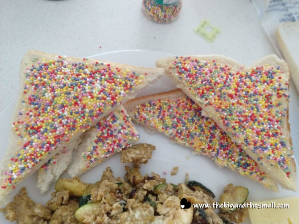 I did some research to see if there were any particularly Australian birthday traditions and the only thing I could find was "fairy bread." It seems to be a tradition mostly for children but we thought we'd give it a try. Fairy bread is white bread (usually with the crusts cut off), spread with margarine and then covered with colorful sprinkles (knowns as "hundreds and thousands" here.) We made some to go with our typical breakfast of scrambled eggs with zucchini and we both decided that fairy bread = not for us. The sprinkles add a weird texture but not much flavor and while they look pretty, I wouldn't call it tasty! I actually only had a couple of bites of mine and made Joel at the rest.