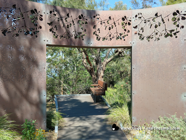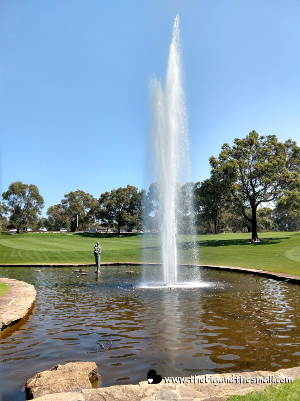 From there we explored the water garden via the "Pathway of Success." This pathway is marked with 53 brass plaques which recognize the contribution women's groups have made to Western Australia. The markers on the path were installed in 1999 as part of the Centenary celebrations for women's suffrage in Western Australia. Additionally, throughout the water garden, there are various art installations by Australian women. This statue in the pond was the first to be installed and is a memorial to pioneer women. The fountains surrounding it were a work of art of their own, changing the height and frequency of their display often.