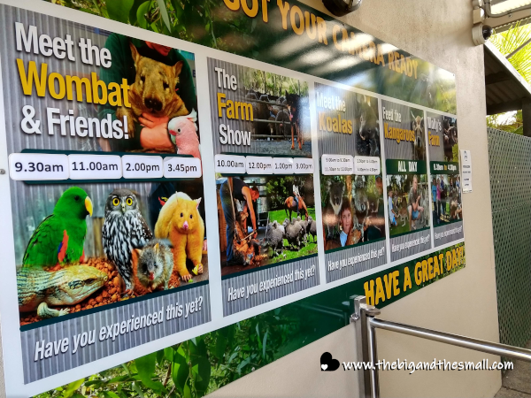 The entry fee was $30 Australian which is currently about $20 US. So, not cheap, but not too crazy expensive, especially considering all that we got to do! We arrived around 10:45 which turned out to be perfect as that meant we could go see the Wombat and Friends at 11:00, then move straight over to pictures with Koalas at 11:30, and then get to the farm show at noon. We got to thoroughly enjoy each exhibit and move through the park efficiently!