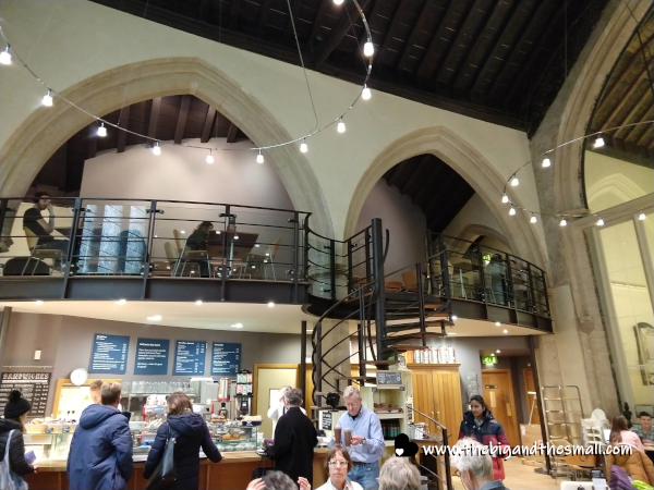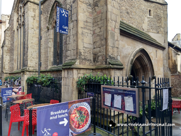 We arrived in town around 11 am, and after exploring a few places we decided to get lunch before we got too hungry. Luckily, we didn't have to do much thinking about where to go, as Joan and Vince had a destination in mind. I think I've mentioned before that Vince and Joan first met online, through an online church start-up. When Joan came to the UK to meet with a whole host of people involved in the church project, Vince offered to pick her up at the train station and take her to the meetings. The very first time they met each other in person they went to Cambridge and ate at a cafe called Michaelhouse. Fittingly, this cafe is inside a former church!