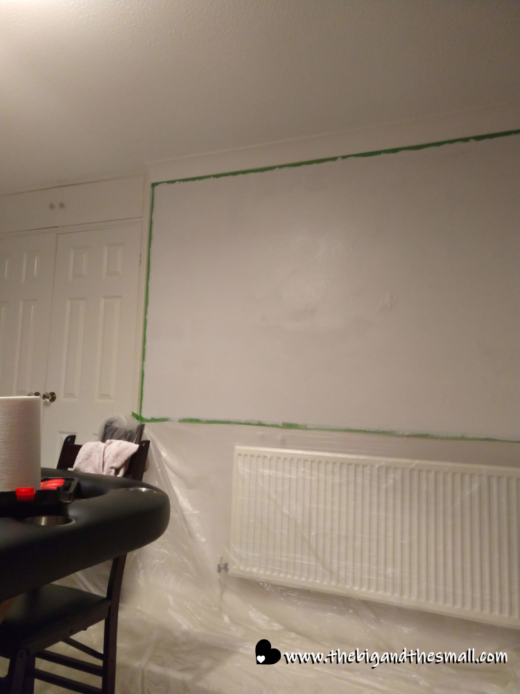 And then we decided to go all in and paint a white square on the wall to be the “screen.” This was much more cost-efficient than trying to purchase and install an actual screen! You can spy our game table is in this room, too, so it was really a movie room/games room. It wasn’t as good as going to the theaters, but in the midst of lockdowns, it really hit the spot! (Little did we know at the time that it would be another 4+ months before we could go back to a real theater.)