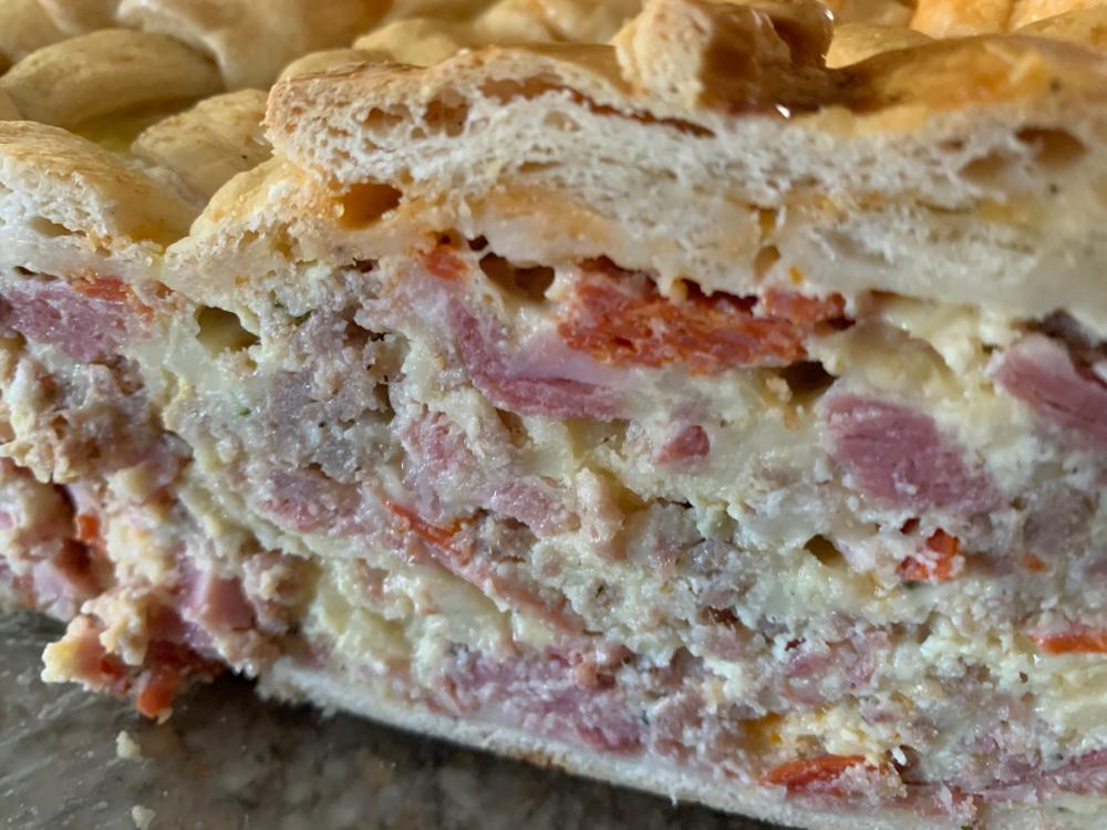 Italian Easter Pizza Pie is unlike any pizza you may have ever seen or tasted. It is Italian sausage, cured Italian meats, four kinds of cheese and eggs stuffed between two layers of crust and baked in a springform pan. It can be traced back to 17th century Naples. The Catholic Lenten tradition requires fasting for 40 days from dairy and eggs. So this became the perfect, indulgent dish to break the Lenten fast.