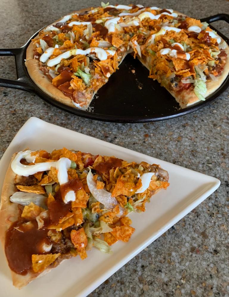 To give the pizza a little bit of authenticity I added a little Masa Harina, which is corn flour, to my pan crust dough. To the base of refried beans, I added taco meat, diced tomatoes, black olives and a Mexican cheese blend. It was garnished with shredded lettuce, Doritos (really not Mexican...lol), taco sauce and sour cream. The boys were happy!