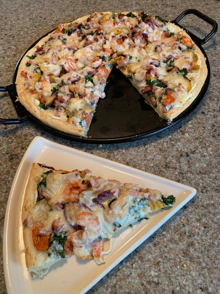 Sunday’s Creation: Roasted Rainbow Carrots & Pancetta Pizza…my pan crust topped with ricotta cheese & roasted garlic, grated asiago cheese, kale, roasted rainbow carrots, pancetta and shredded fontina cheese.
