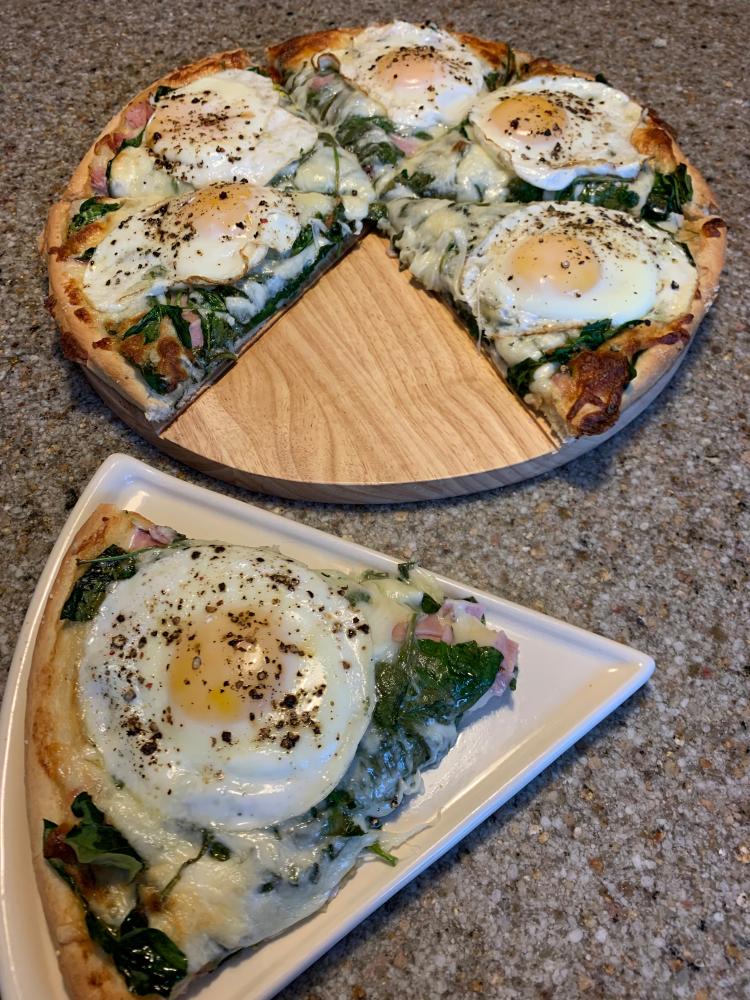 Sunday’s Creation: Sunny Side Up Pizza…my pan crust topped with Dijon Mustard, gruyere cheese, Parmesan, thinly sliced deli ham, baby spinach, mozzarella, sunny side up eggs and freshly cracked pepper.
