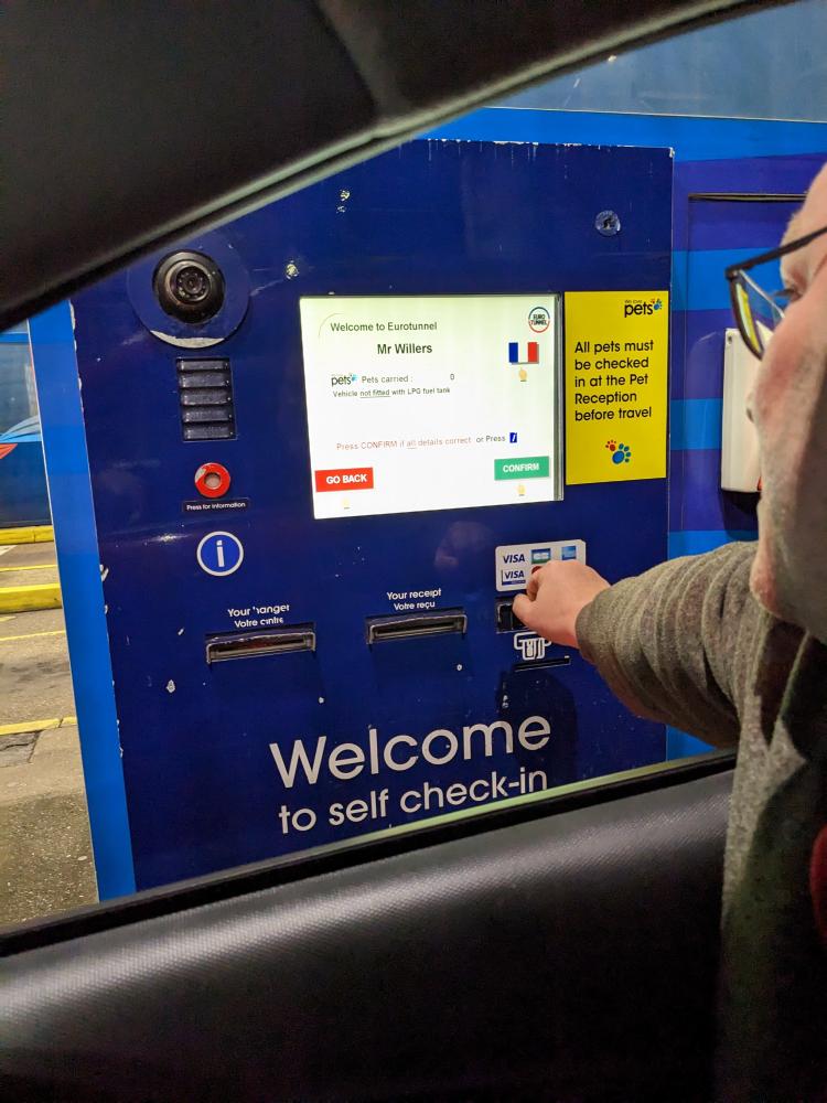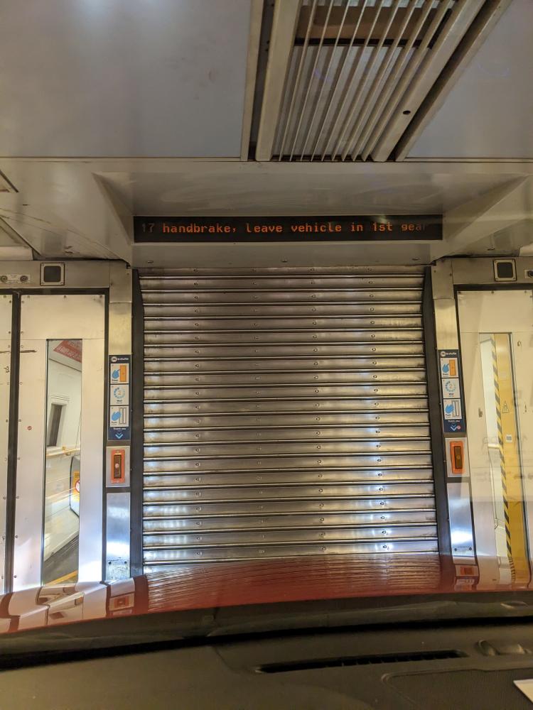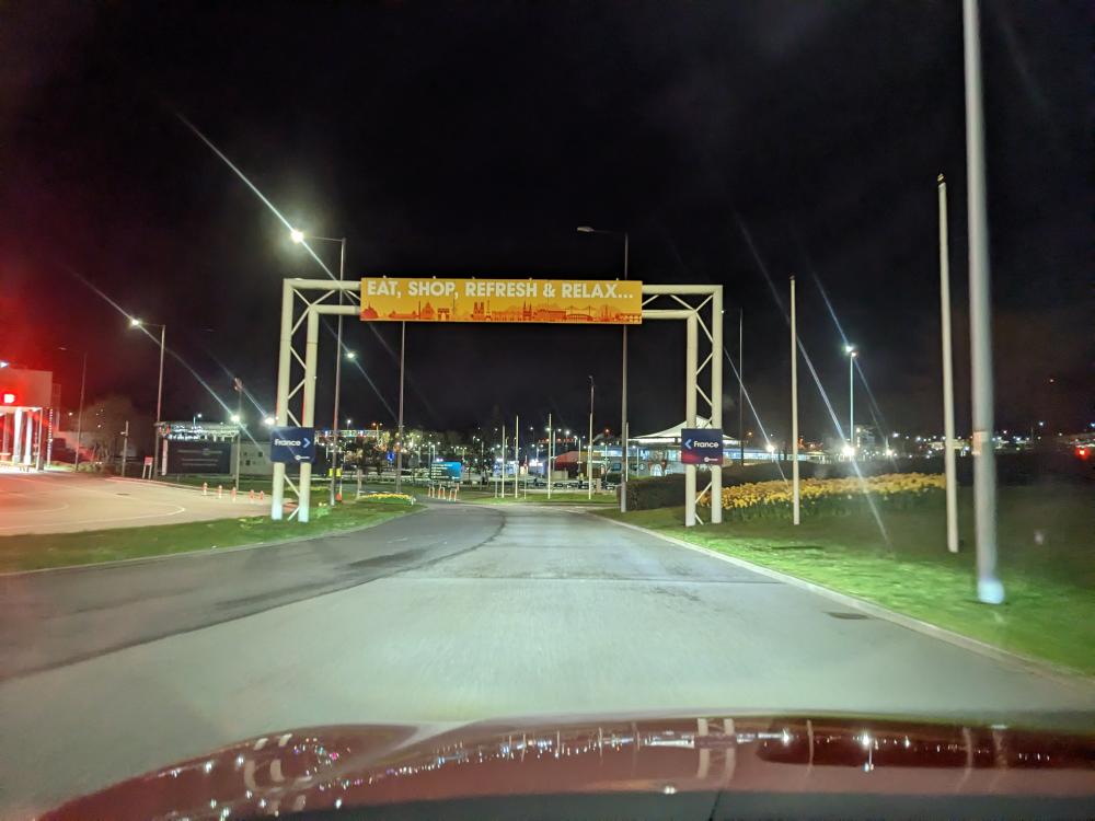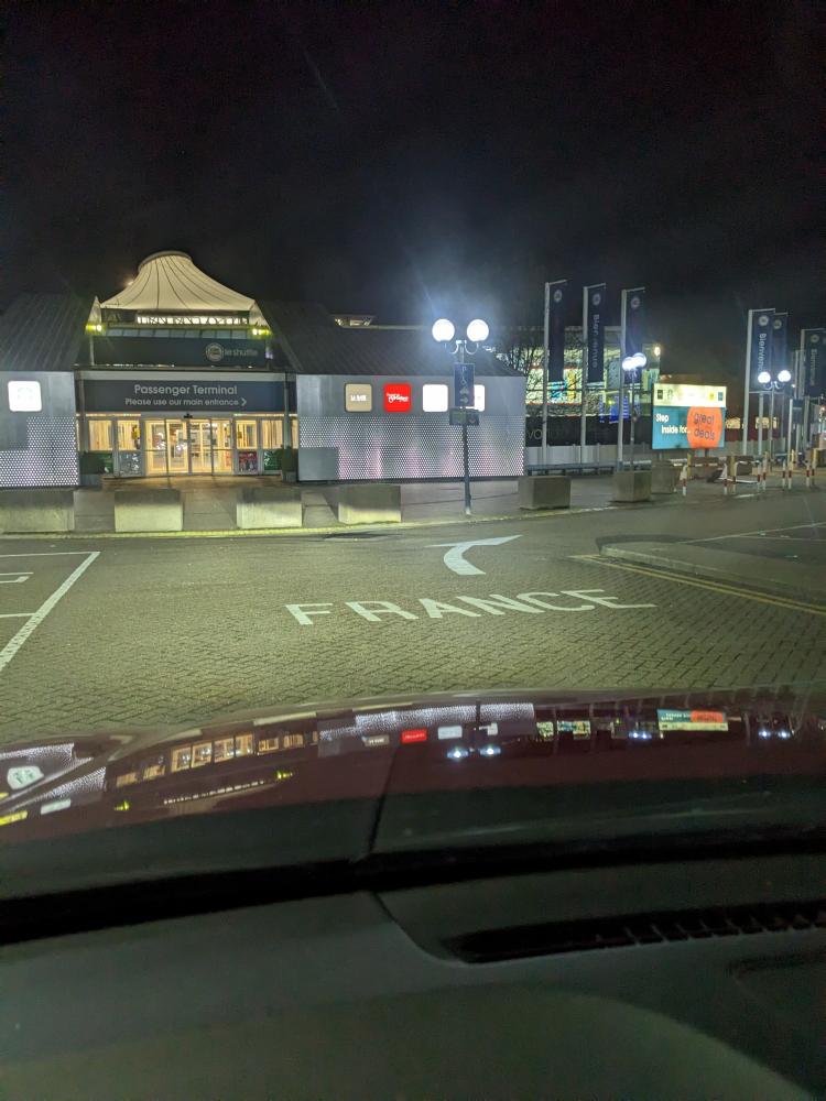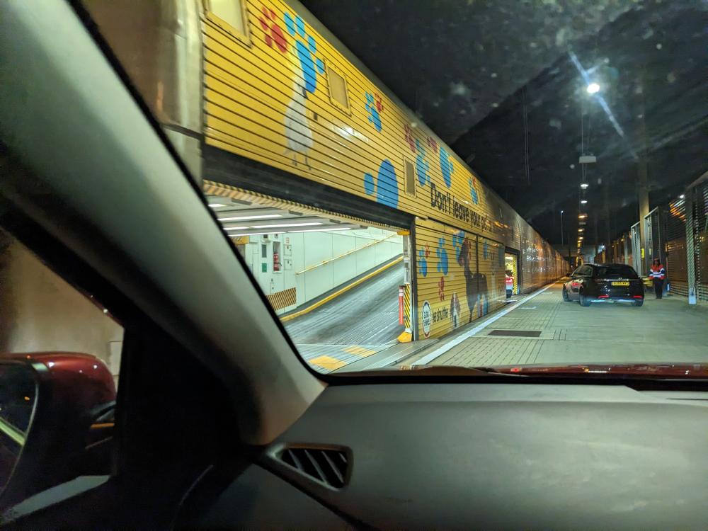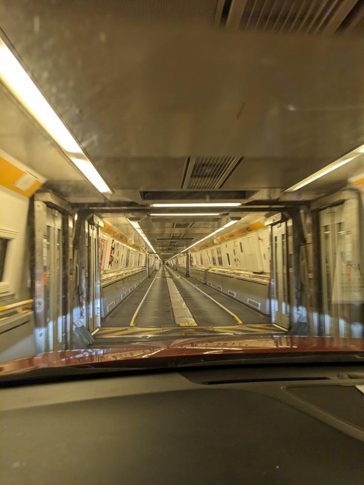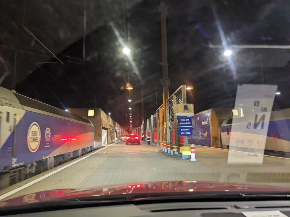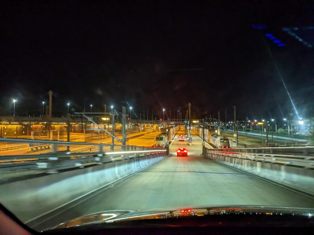 We left theirs around 11pm, planning to drive through the night to get to the Channel Tunnel (aka the Chunnel). This is the underwater railway tunnel that connects the UK with France. Steve said it used to be very cheap to take, like £20 for a return ticket. These days it cost £120 to go one way - and that was at 4:00ish in the morning which was discounted from more peak times. It would have been cheaper to take a ferry, but we wanted to experience the chunnel at least once. And an experience it is!