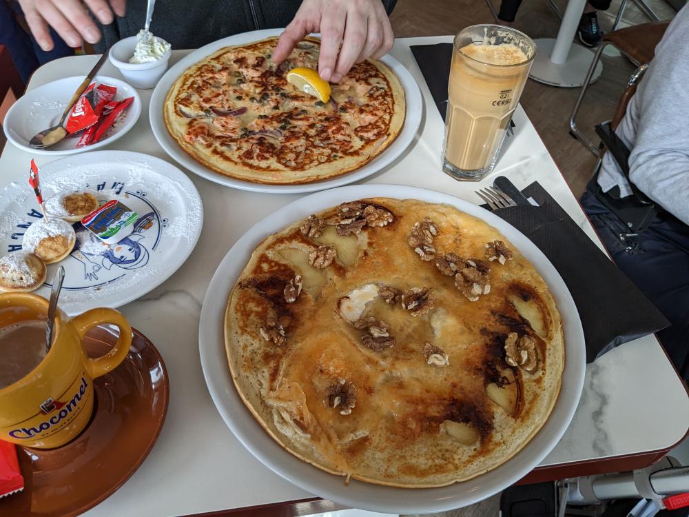 In our passing around of different pancakes to try, Joel's hot chocolate drink was a casualty and ended up on the floor (and his shorts.) But it was worth it to get to try all of the different varieties. We ordered way too much at a pancake each, but Joel made sure none went to waste and we went away leaving clean plates behind!