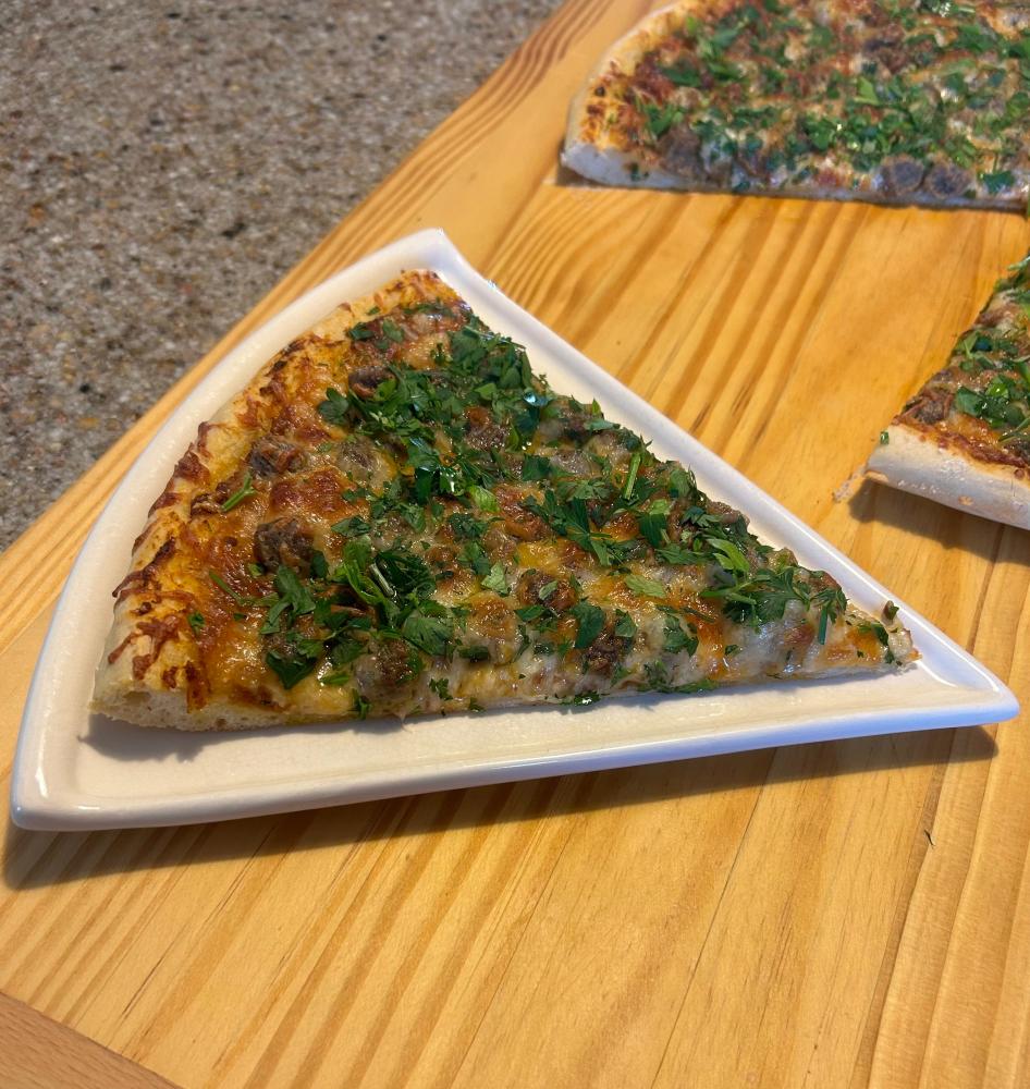 Sunday’s Creation: A Cheesy Meatball Pizza…a thin, crispy crust topped with red sauce, grated Parmesan, shredded Parmesan, cheddar, mini-meatballs, mozzarella then garnished with parsley from the garden and a drizzle of garlic olive oil.