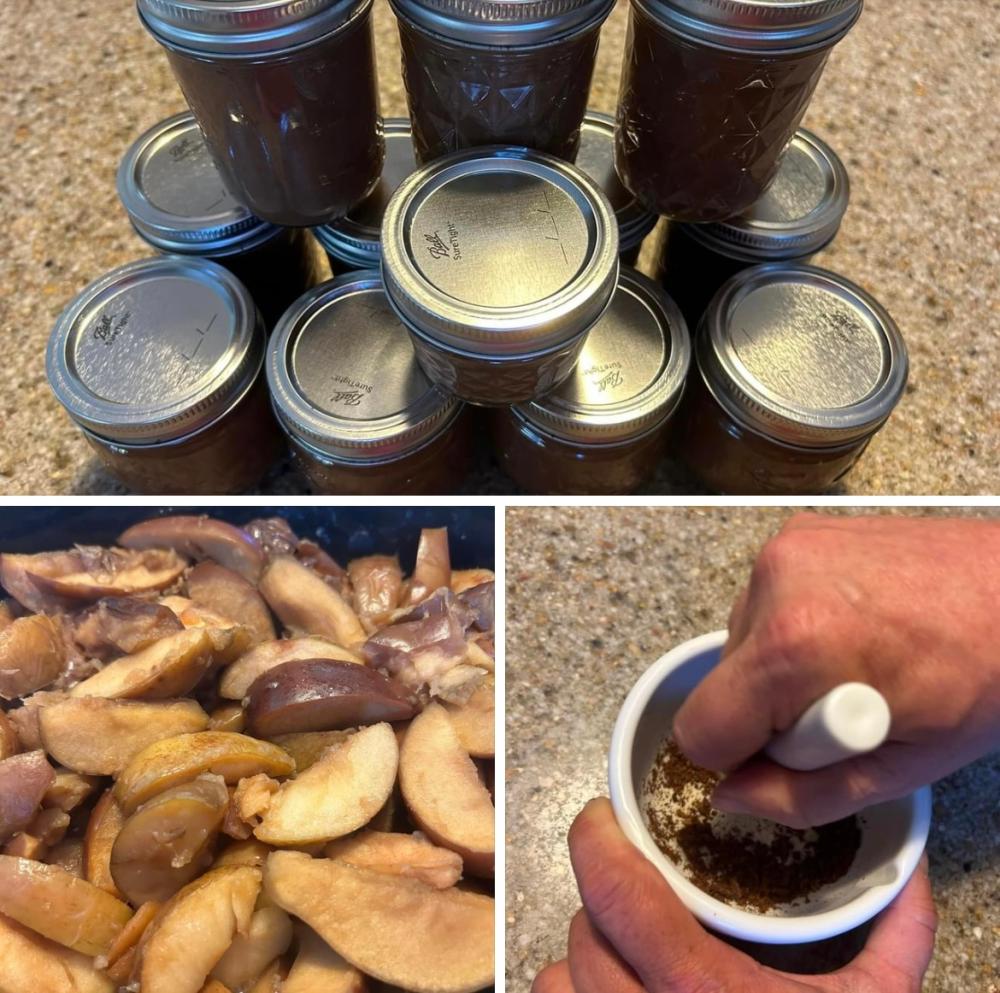 We finished up Crockpot Apple Butter on Sunday afternoon…yielded 11 half-pints to freeze. And 1-quarter pint for Keith & Linda Sheriff who gave us the apples from their tree. Thank you to Matthew for grinding up the whole cloves as I was out of ground cloves.