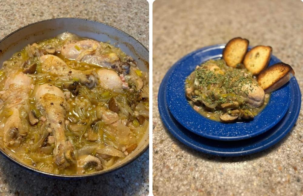 Soup on Saturday: Happy Fall…our favorite time of year! We have been inspired by an article, ‘36 Best Hearty Fall Soups to Warm Your Body and Soul’. Our plan is to try each recipe. First up is…White Wine Coq Au Vin with garlic bread. (Here is the link if you want to check it out!)