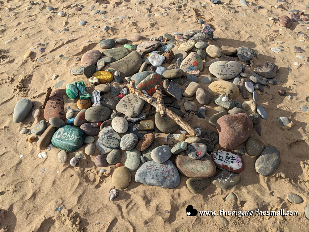 While in Tenby, we talked to someone in the gift shop of the RNLI (Royal Navy Lifeboat Institute) who reminded us that some nearby beaches were filming sites for the Harry Potter films. So we headed to Freshwater West beach where Dobby the elf was “buried,” and looked for his grave. People visit here every year to add rocks and socks to the memorial.