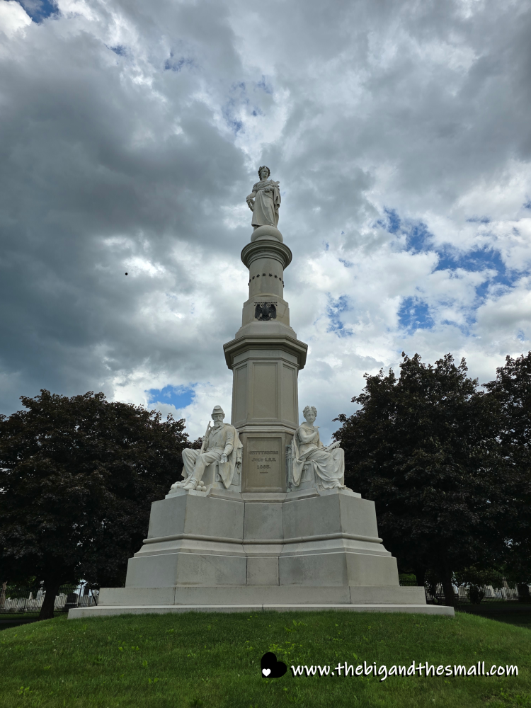 After lunch we did a driving tour of the Gettysburg battlefield and memorials. I did not realize the place was so huge! We ended with a walking tour of the Gettysburg National Cemetery. After the battle, over 7,500 soldiers were buried in hasty, shallow graves on the battlefield. A national movement campaigned to build this cemetery and move the bodies to a more respectful place. The cemetery was dedicated on November 19, 1863 and was the location of Lincoln’s famous “Gettysburg Address.” This statue is the soldiers national monument that sits at the heart of the cemetery.