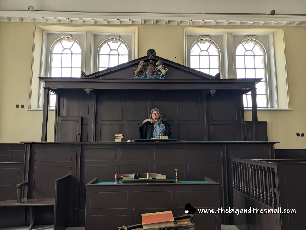Friday May 10th was a big day. We headed to Monmouth to start the day so we could take the car in to get some (more) work done. Luckily from there it was a short walk into town and we finally did something I have wanted to do since 2020 - have a proper tour of the Shire Hall! I attended work functions in the upstairs of this building, but in the downstairs, they still have the court room and dungeons from the famous Chartist trials of 1839. Here’s Joel pretending to be a judge sentencing someone to death.