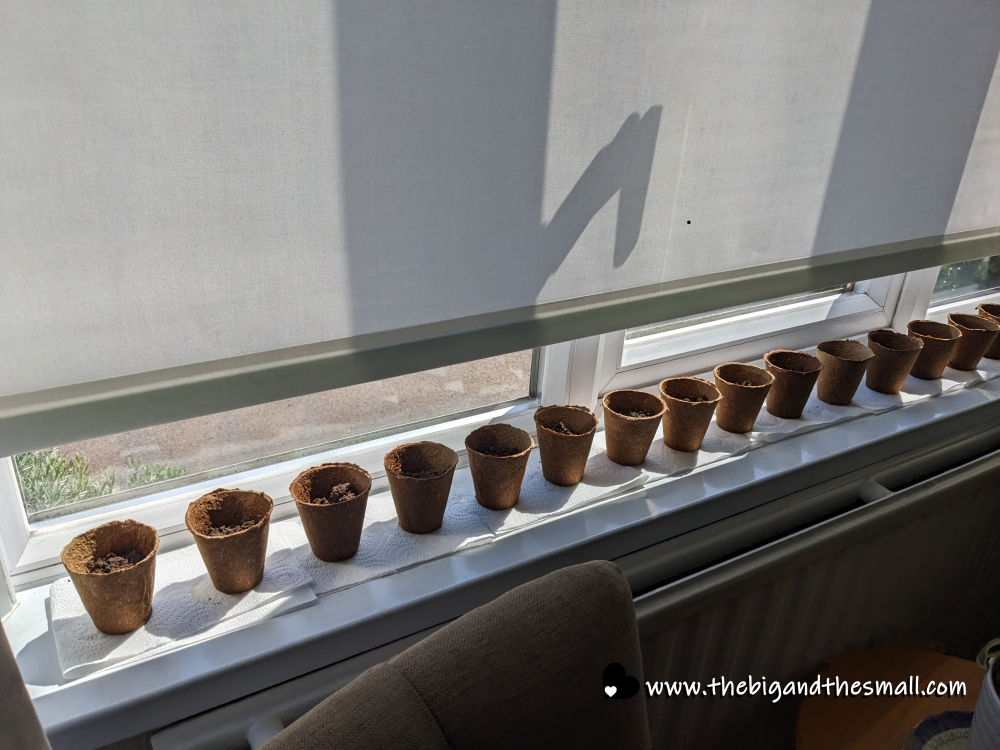 One of my goals this year is to grow my own pumpkins for Halloween, and after a bit of research, I learned that May is the time to plant them. We went to the local gardening store for seeds and advice - and the advice was to plant the seeds in little pots and keep them indoors until they have sprouted, which takes about 2 weeks. Here are my little pumpkin babies all lined up on the window sill where they can get some sun.