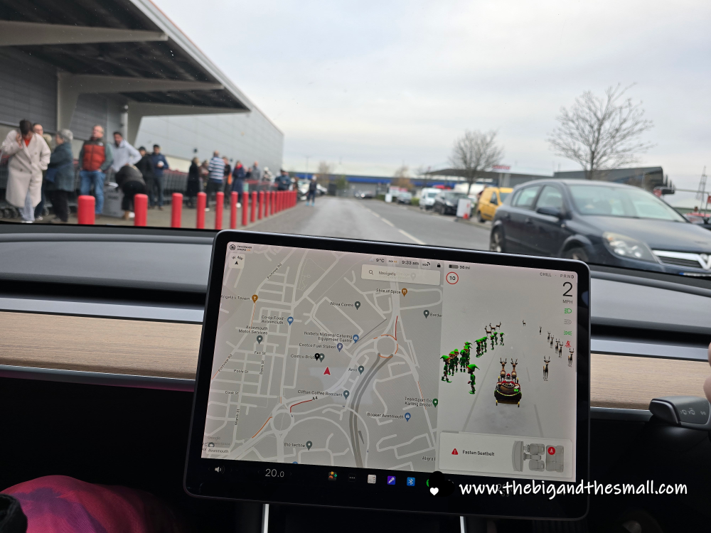 On Black Friday we made the annual pilgrimage to Costco, which Vince and Joan were happy to join us for. Google told us the wrong opening time so we ended up arriving before they opened, which gave us time to play around with some of the features on the car. I was delighted to turn it to “Santa mode” which makes our car look like Santa’s sleigh, other cars look like reindeer, and pedestrians look like elves! I will get a kick out of this until Christmas.